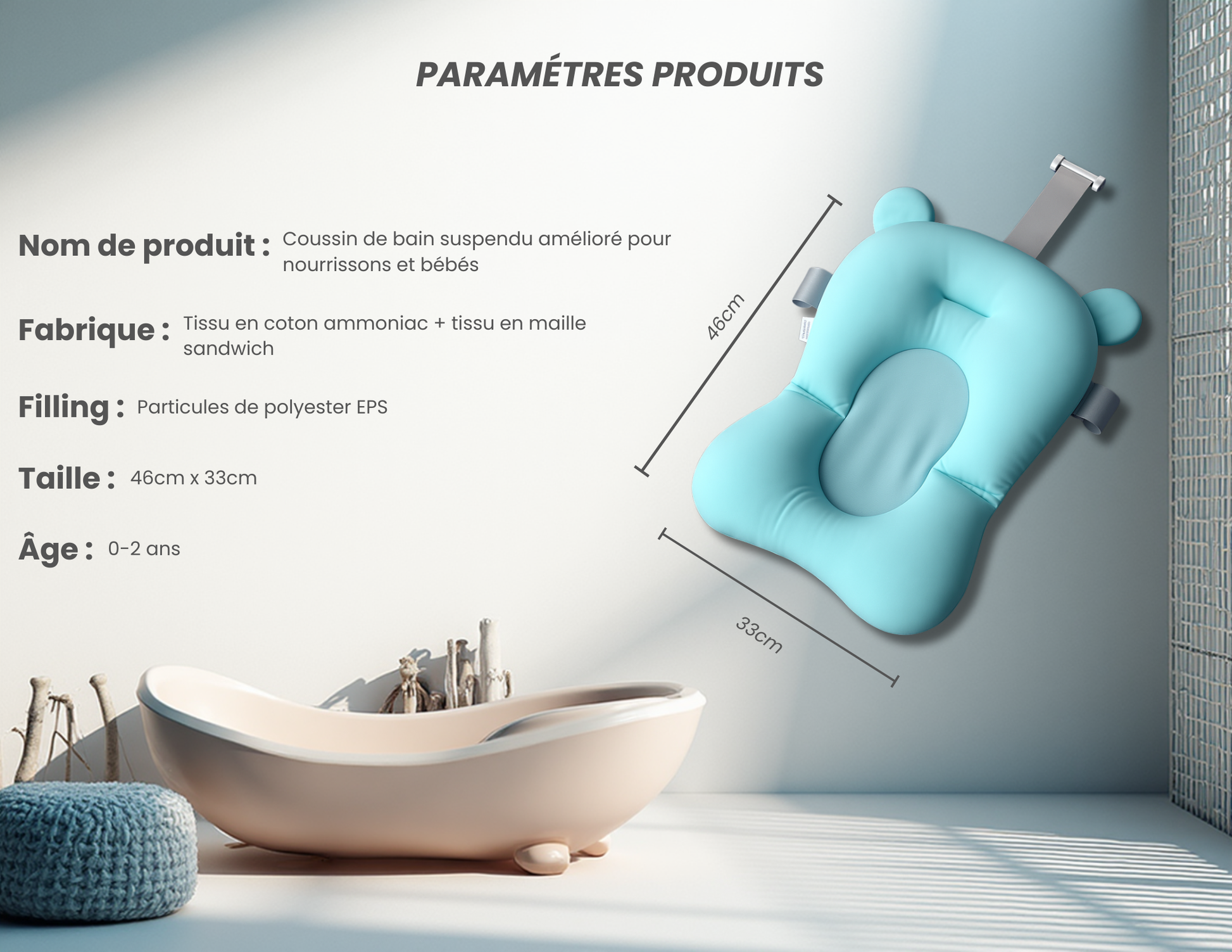 Le coussin est antidérapant, épouse la forme du corps du bébé et maintient sa tête hors de l’eau.